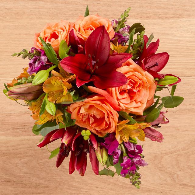 Stand out from the crowd with this spicy arrangement of red lilies, burgundy snapdragons and orange roses.
